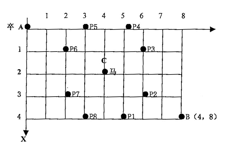同时在棋盘上的任一点有一个对方的马(如图中的C点),该马所在的点和所有跳跃一步可达的点称为对方马的控制点。例如图中C点上的马可以控制9个点。卒不能走到对方马的控制点。