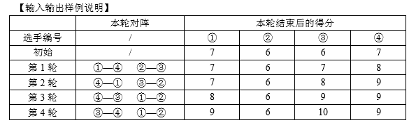 【背景】在双人对决的竞技性比赛,如乒乓球、羽毛球、国际象棋中,最常见的赛制是淘汰赛和 循环赛。前者的特点是比赛场数少,每场都紧张刺激,但偶然性较高。后者的特点是较为公 平,偶然性较低,但比赛过程往往十分冗长。 本题中介绍的瑞士轮赛制,因最早使用于 1895 年在瑞士举办的国际象棋比赛而得名。 它可以看作是淘汰赛与循环赛的折衷,既保证了比赛的稳定性,又能使赛程不至于过长。