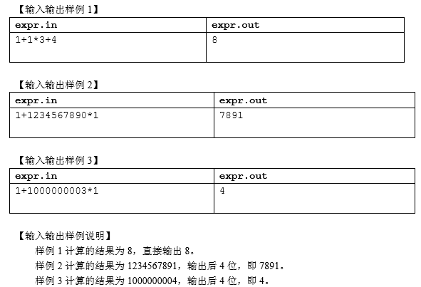 数据范围: 对于 30%的数据,0≤表达式中加法运算符和乘法运算符的总数≤100; 对于 80%的数据,0≤表达式中加法运算符和乘法运算符的总数≤1000; 对于 100%的数据,0≤表达式中加法运算符和乘法运算符的总数≤100000。