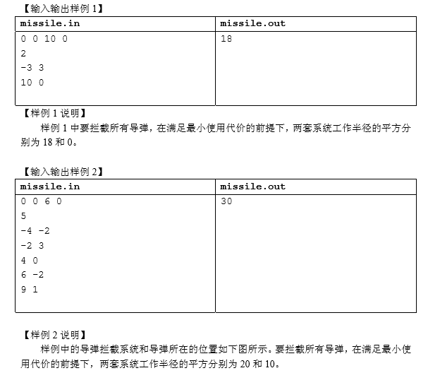 经过 11 年的韬光养晦,某国研发出了一种新的导弹拦截系统,凡是与它的距离不超过 其工作半径的导弹都能够被它成功拦截。当工作半径为 0 时,则能够拦截与它位置恰好相同 的导弹。但该导弹拦截系统也存在这样的缺陷:每套系统每天只能设定一次工作半径。而当天的使用代价,就是所有系统工作半径的平方和。 某天,雷达捕捉到敌国的导弹来袭。由于该系统尚处于试验阶段,所以只有两套系统投 入工作。如果现在的要求是拦截所有的导弹,请计算这一天的小使用代价。