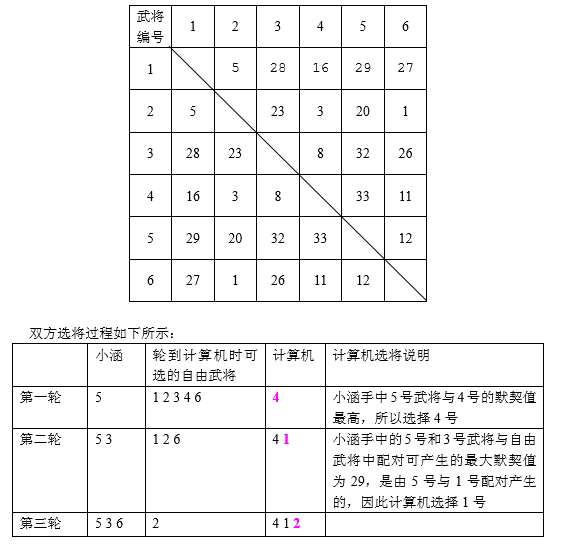 2,3,5 号武将中,3 号和 5 号配合好,默契值为 32,而计算机能推出的好组合 为 1 号和 6 号,