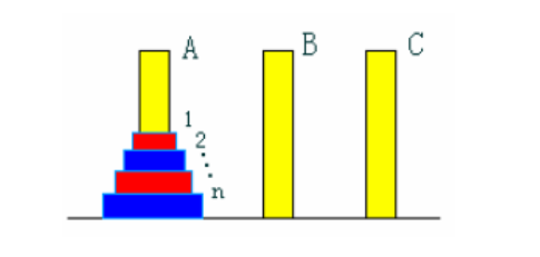 现要求将塔座A上的这一叠圆盘移到塔座B上,并仍按同样顺序叠置。在移动圆盘时应遵守以下移动规则: