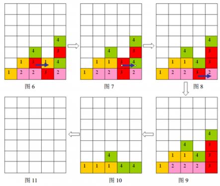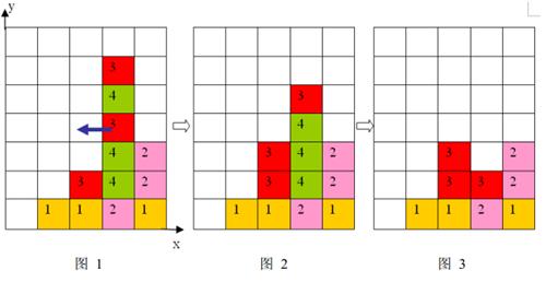 上面图1 到图 3 给出了在棋盘上移动一块方块之后棋盘的变化。棋盘的左下角方块的坐标为(0, 0 ),将位于(3, 3 )的方块向左移动之后,游戏界面从图 1 变成图 2 所示的状态,此时在一竖列上有连续三块颜色为4 的方块,满足消除条件,消除连续3 块颜色为4 的方块后,上方的颜色为3 的方块掉落,形成图 3 所示的局面。