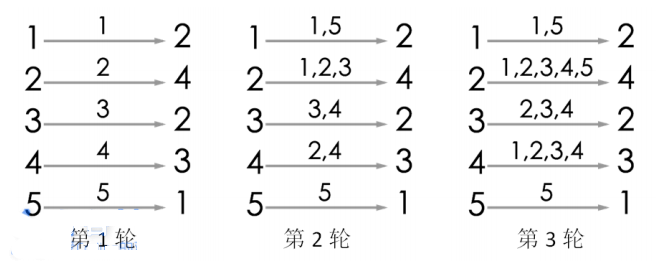 2 4 2 3 13样例1解释:游戏的流程如图所示。当进行完第 3 轮游戏后, 4 号玩家会听到 2 号玩家告诉他自己的生日,所以答案为 3。当然,第 3 轮游戏后, 2 号玩家、 3 号玩家都能从自己的消息来源得知自己的生日,同样符合游戏结束的条件。