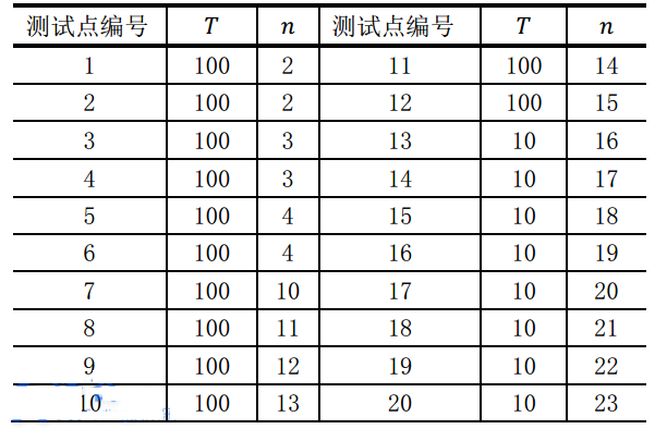 对于前20个测试点, 我们约定手牌组数T与张数n的规模如下:(数据不保证所有的手牌都是随机生成的)
