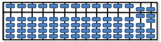 算盘被中间的横档分为上下半区,上方只有1颗表示该位上的5,靠近中间的横档就计数5,只要拨动它就累计一次拨动,下方的四颗每颗表示1,靠近横档就计相应个数的1,下方需要拨动多颗可以合并为一次拨动。