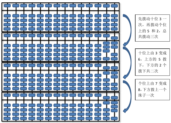 注意:珠算里面的手法习惯是高位先算(这迎合了我们读数字的习惯)