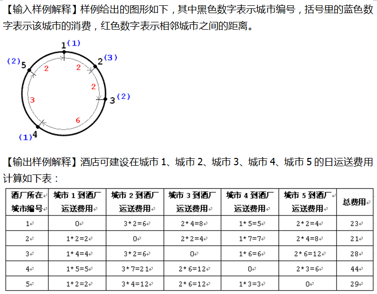 某岛的居民酷爱一种无酒精啤酒。以前这种啤酒都是从波兰进口,但今年居民们想建一个自己的啤酒厂。岛上所有城市都坐落在海边,并且由一条沿海岸线的环岛高速路连接。酒厂的投资者收集了关于啤酒需求量的信息,即每天各城市消费的啤酒桶数。另外还知道每相邻城市之间的距离(单位:千米),另外还知道每桶啤酒每千米的运费是1元。日运费是将所需的啤酒运到所有城市所需费用之和。日运费的多少和啤酒厂的选址有关系。投资者想找到一个合适的城市来修建酒厂。以使日运费最少。