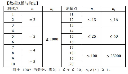 在一个完善的货币系统中,每一个非负整数的金额 x 都应该可以被表示出,即对每一个非负整数 x,都存在 n 个非负整数 t[i] 满足 a[i]× t[i] 的和为 x。然而,在网友的国度中,货币系统可能是不完善的,即可能存在金额 x 不能被该货币系统表示出。例如在货币系统 n=3, a=[2,5,9] 中,金额 1,3 就无法被表示出来。