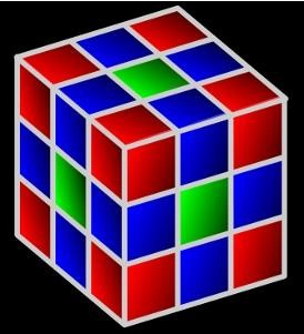 考虑3*3*3的立方体,有六个面,每个面有九个正方形。染色方法如下: