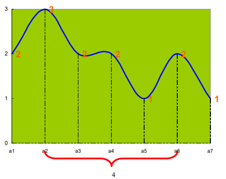 如图所示,地形数据为 2、3、2、2、1、2、1,最佳场地的水平距离是 4。